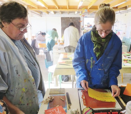 Puis on se sépare en 2 groupes : un groupe travaille les textes de la Bible et un autre groupe est à l'atelier peinture avec Gérard, l'ami peintre